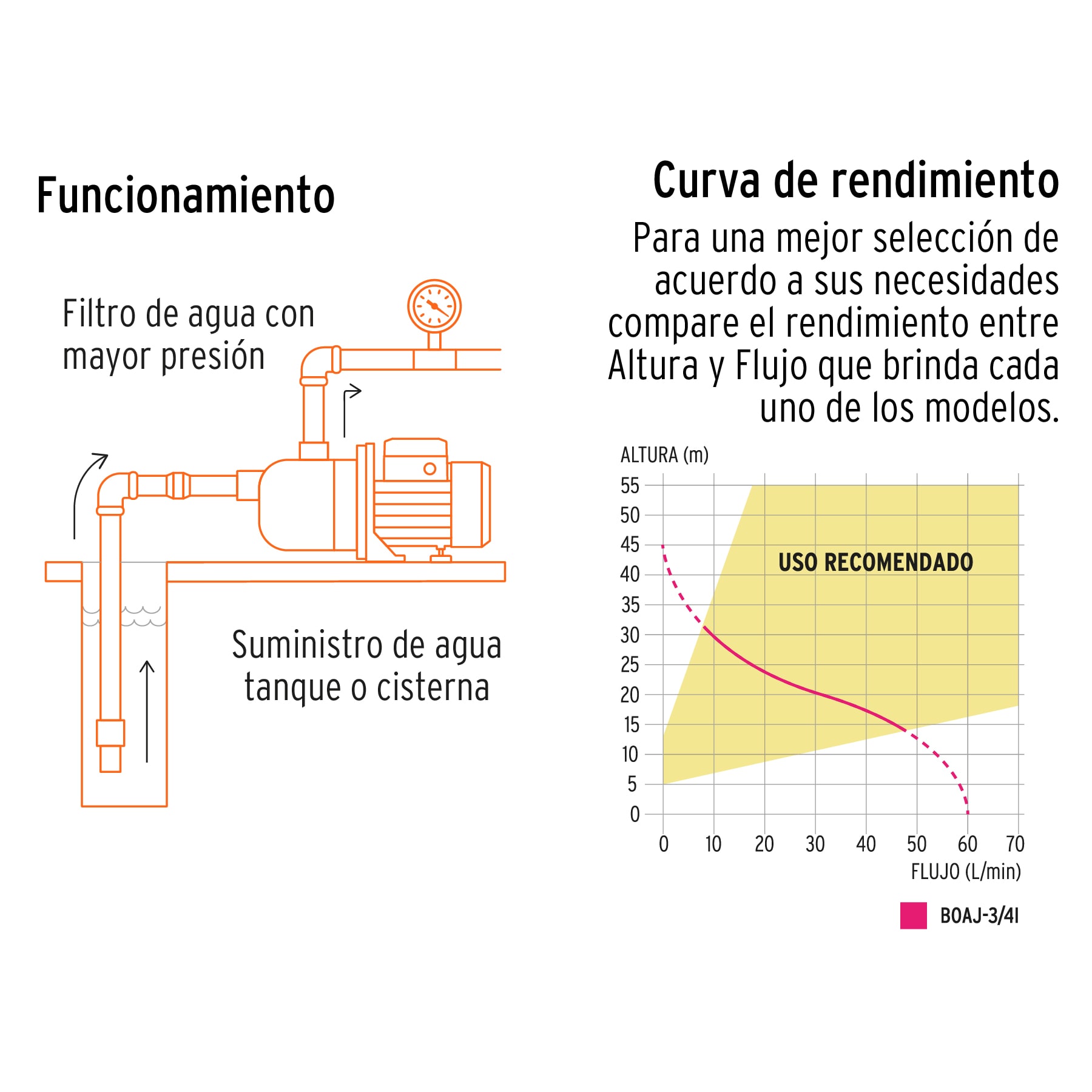 - Bomba tipo «Jet» con cabezal de acero inoxidable resistente a la corrosión y silencioso