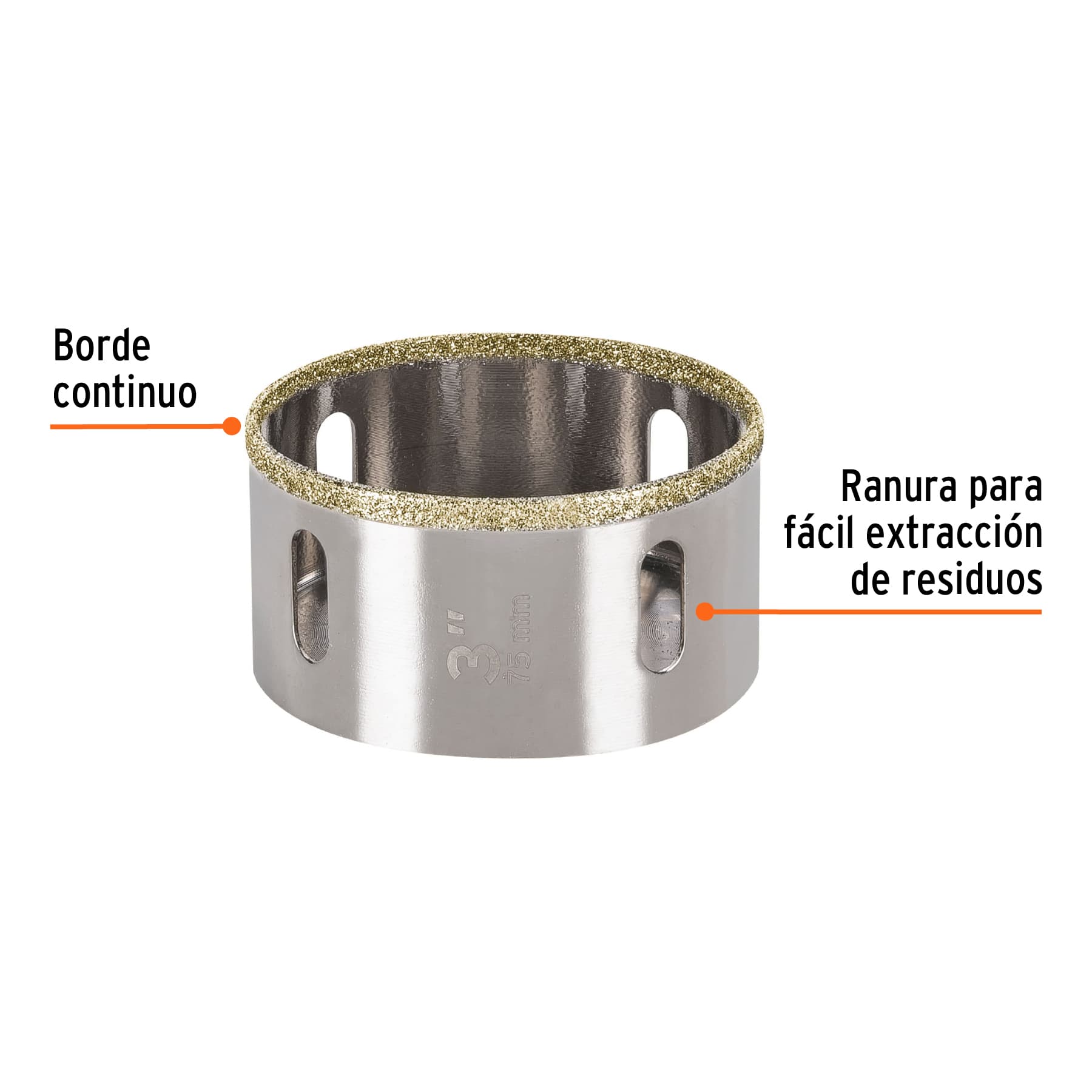 - Borde continuo con rosca y recubrimiento de diamante para cortes rápidos y finos sin despostillar, loseta cerámica, vidrio, mármol y porcelanato