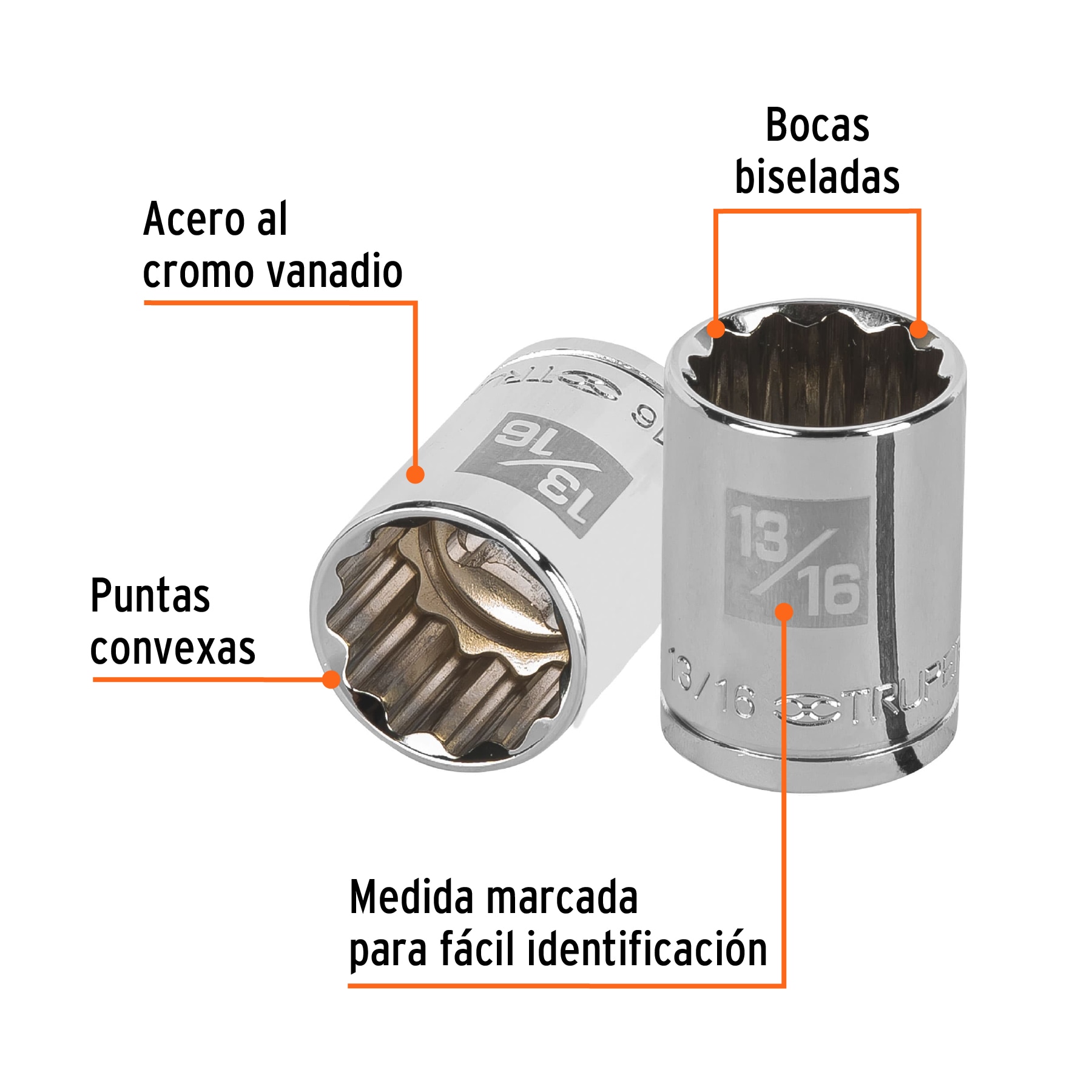 - Sistema de sujeción Truper-Drive con puntas convexas que aseguran y aumentan el torque sin dañar tuercas ni cabezas de tornillos