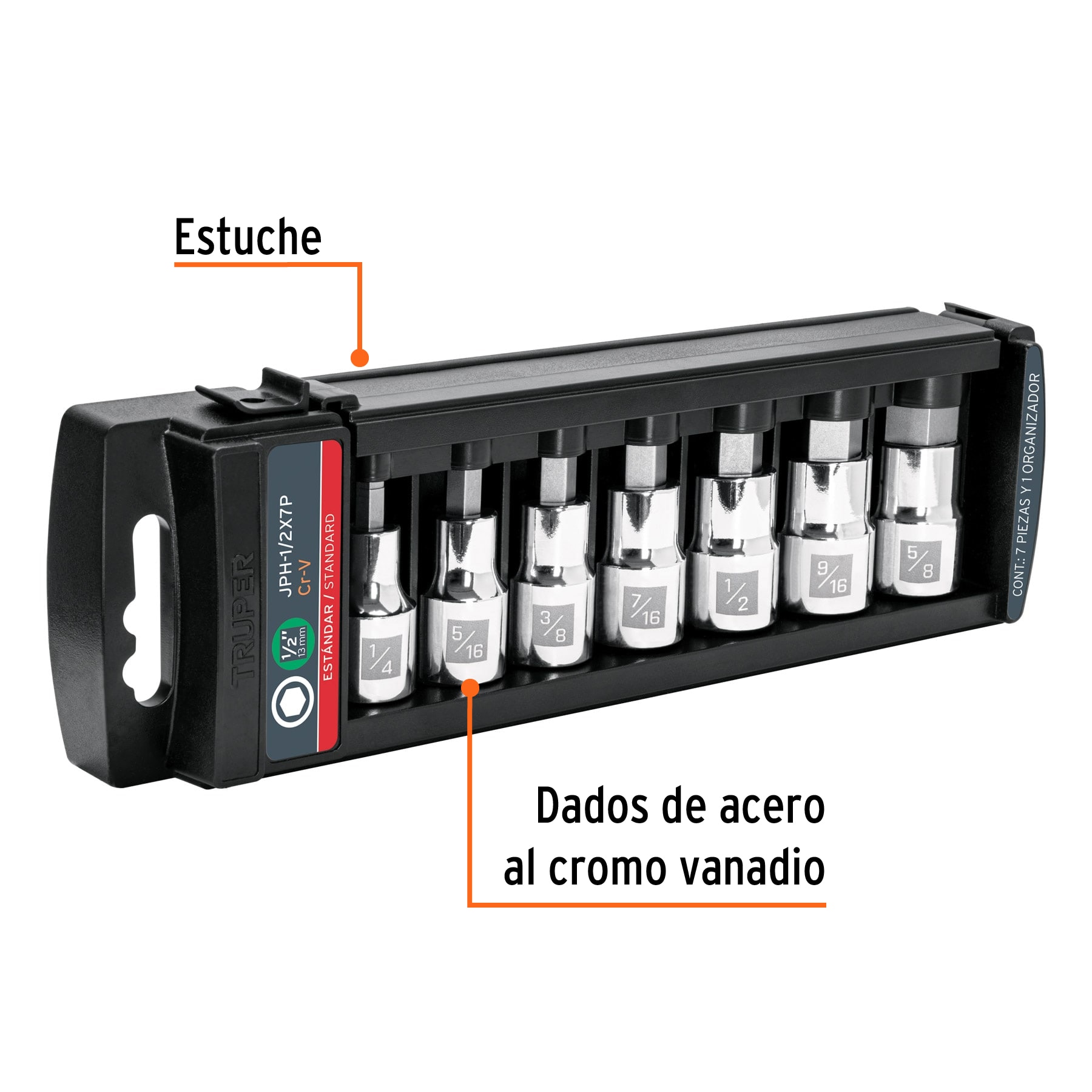 Juego de 7 dados cuadro 1/2″ punta hexagonal std Truper