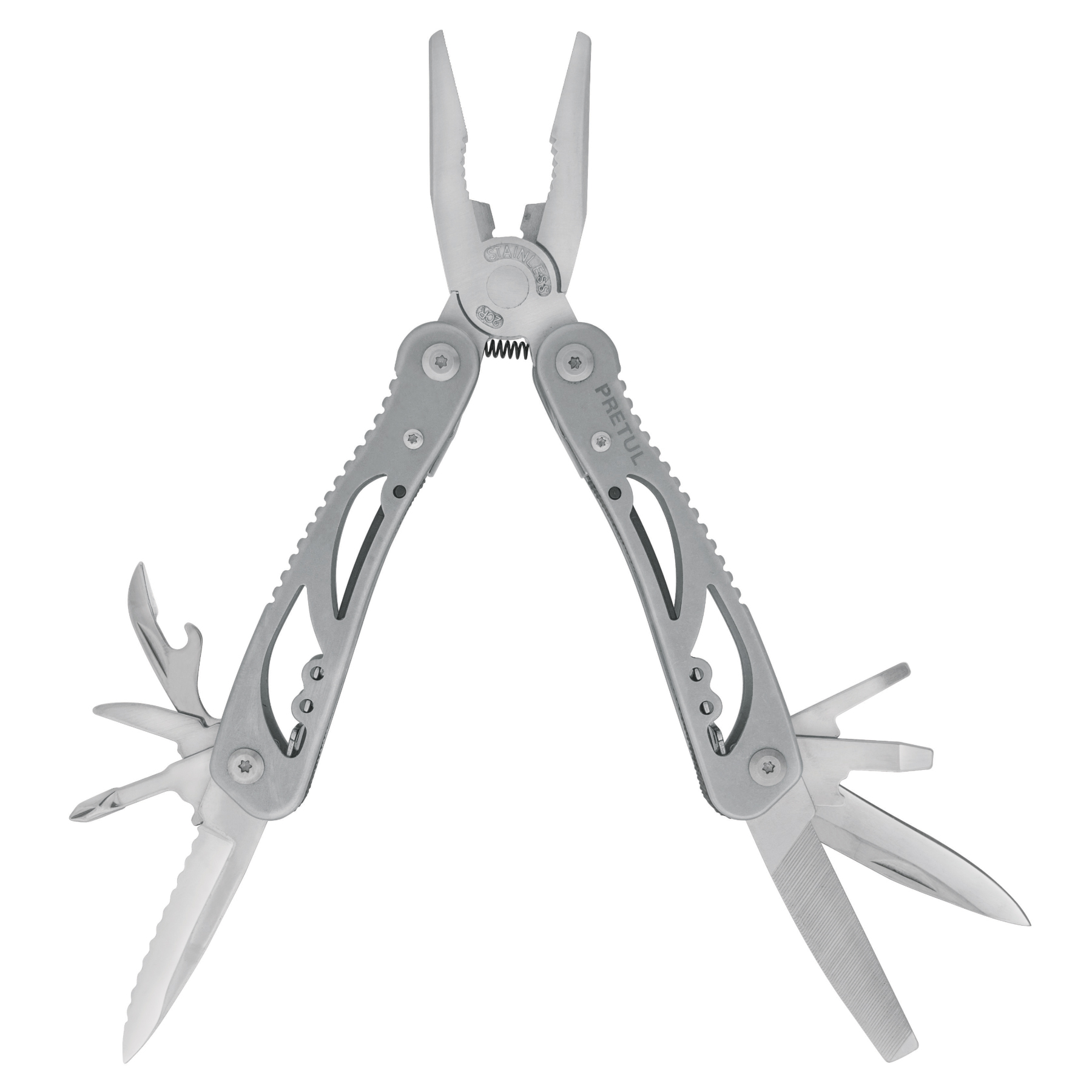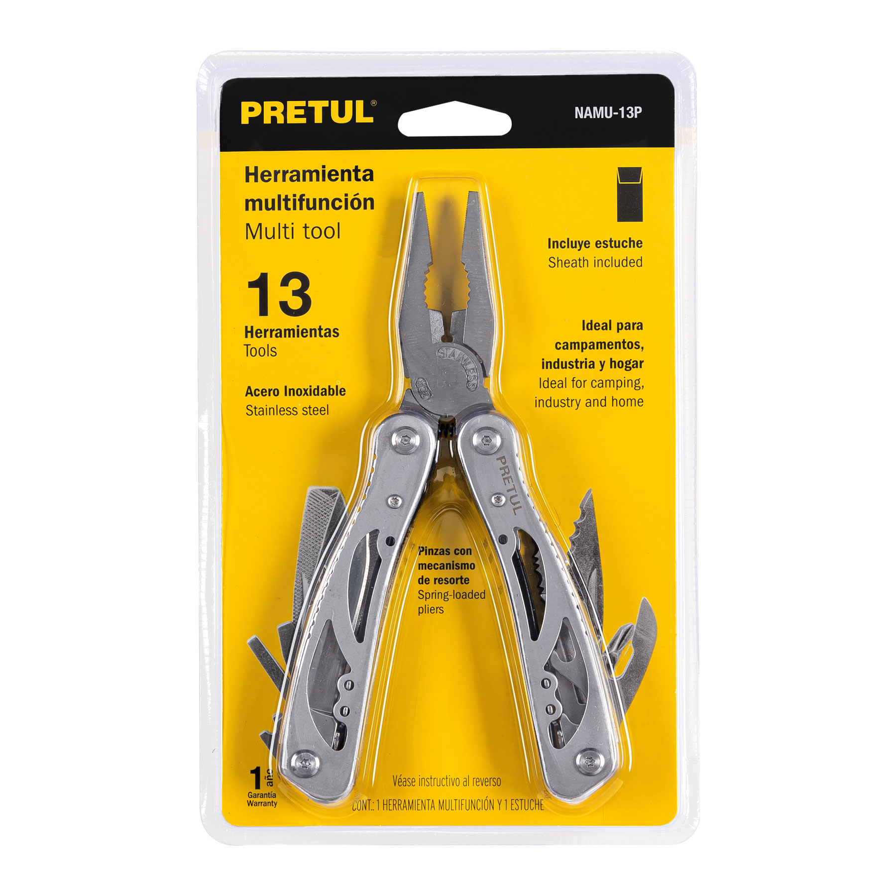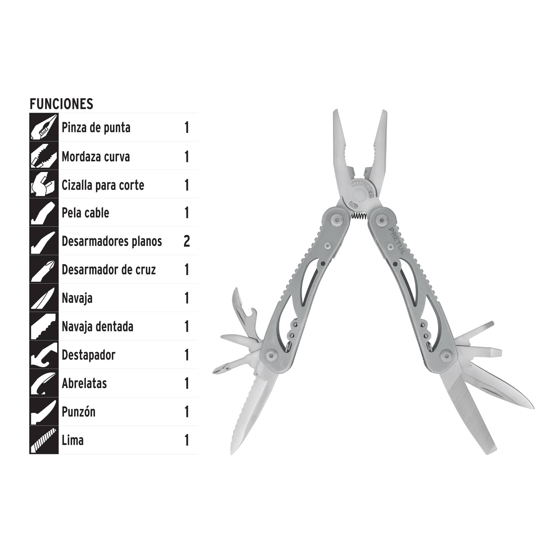 - Funciones de pinza de punta, mordaza curva, cizalla para corte, pela cable, 2 desarmadores planos, desarmador de cruz, navaja, navaja dentada, destapador, abrelatas, punzón y lima